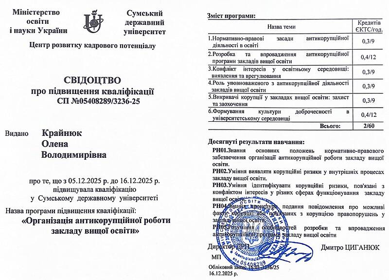 Формування нульової толерантності до корупції є одним із пріоритетів сучасного університету. Завідувачка кафедри кібербезпеки Олена Крайнюк долучилася до програми підвищення кваліфікації «Організація антикорупційної роботи закладу вищої освіти», організованої Сумським державним університетом. Під час інтенсивного курсу учасники розглядали не лише юридичні аспекти, а й практичні інструменти розбудови доброчесного середовища. Особлива увага приділялася питанням академічної доброчесності як основи протидії корупції, а також механізмам захисту викривачів. Отримані знання допоможуть вдосконалити внутрішні процеси нашого університету, зокрема в аспектах ідентифікації корупційних ризиків та ефективного врегулювання конфліктів інтересів. Це черговий крок до утвердження європейських стандартів освіти в ХНАДУ.