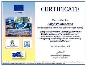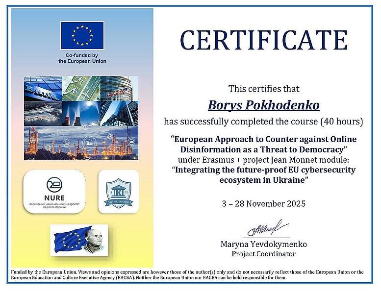 Викладачі кафедри кібербезпеки продовжують вдосконалювати свою професійну майстерність, долучаючись до міжнародних освітніх ініціатив. У листопаді 2025 року викладачі кафедри кібербезпеки Михайло Піксасов та Борис Походенко успішно пройшли 40-годинний курс «Європейський підхід до протидії онлайн-дезінформації як загрозі демократії» («European Approach to Counter against Online Disinformation as a Threat to Democracy»). Навчання відбулося на базі ХНУРЕ в межах проєкту Erasmus+ Жан Моне «Інтеграція перспективної екосистеми кібербезпеки ЄС в Україні» (EUCyberEcoUA, 2024-2027). Участь у таких проєктах дозволяє нашим викладачам: • Вивчати передові європейські практики боротьби з дезінформацією; • Інтегрувати отримані знання в освітній процес для підготовки фахівців з кібербезпеки; • Розвивати міжнародну співпрацю в академічному середовищі. Вітаємо колег з отриманням сертифікатів та бажаємо подальших професійних успіхів!