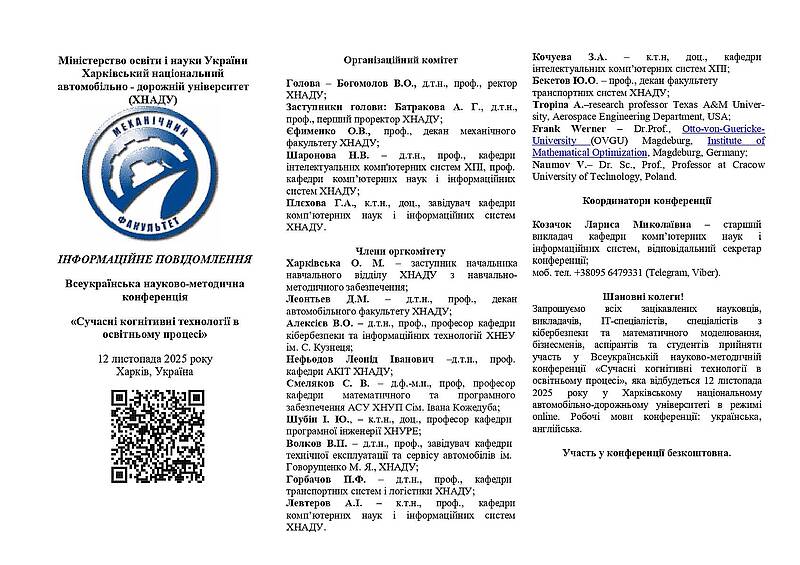 12 листопада 2025 року в Харківському національному автомобільно-дорожньому університеті відбудеться Всеукраїнська науково-методична конференція «Сучасні когнітивні технології в освітньому процесі». До участі запрошуються науковці, викладачі, ІТ-спеціалісти, фахівці з кібербезпеки, математичного моделювання, аспіранти та студенти. Конференція проходитиме в онлайн-режимі, робочі мови – українська та англійська. Участь безкоштовна.
