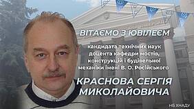 З нагоди ювілею кандидата технічних наук, доцента кафедри мостів, конструкцій і будівельної механіки імені В. О. Російського Сергія Миколайовича Краснова Наукова бібліотека підготувала віртуальну виставку його наукових та навчально-методичних праць. Віртуальна експозиція презентує наукові публікації, що відображають широту професійних інтересів ученого, актуальність його досліджень і значущість результатів для освітнього процесу університету.