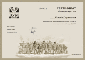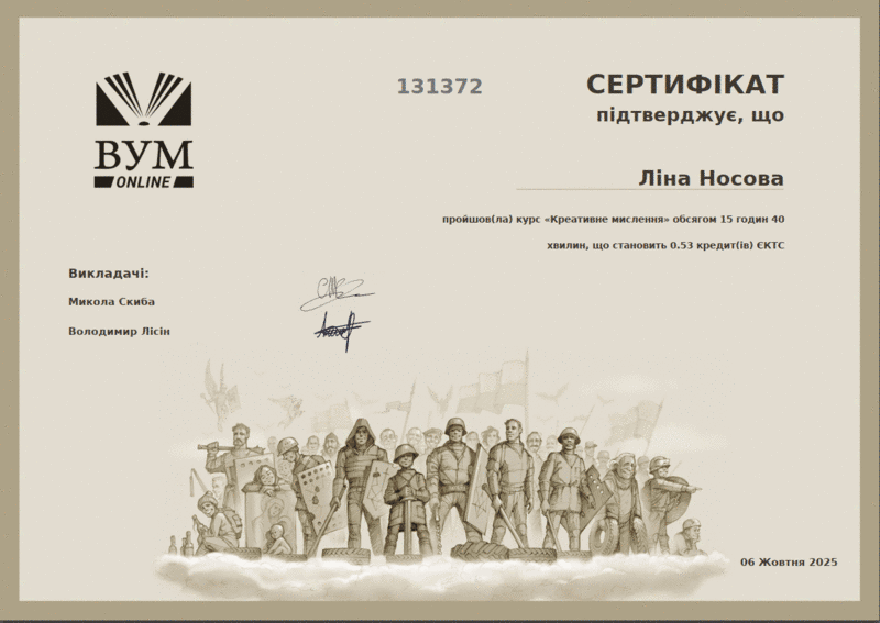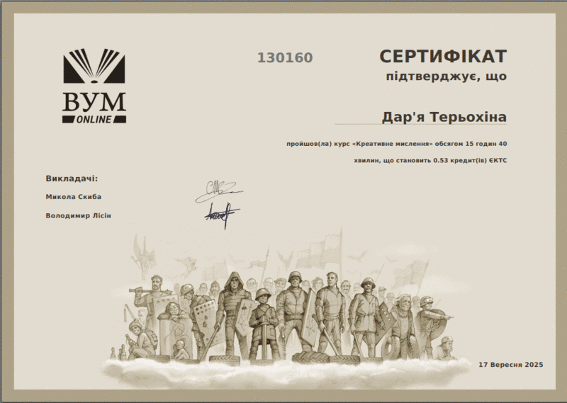 – курс «Креативне мислення» на платформі ВУМ Online, обсягом 15 годин 40 хвилин (0,53 кредити ЄКТС), який опанували Носова Ліна, Глумакова Ксенія та Терьохіна Дар’я;