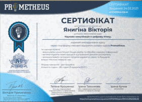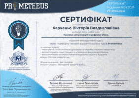 – курс «Наукова комунікація в цифровому середовищі», реалізований на платформі масових відкритих онлайн-курсів Prometheus, обсягом 90 годин (3 кредити ЄКТС), який пройшли Харченко Вікторія та Янігіна Вікторія;