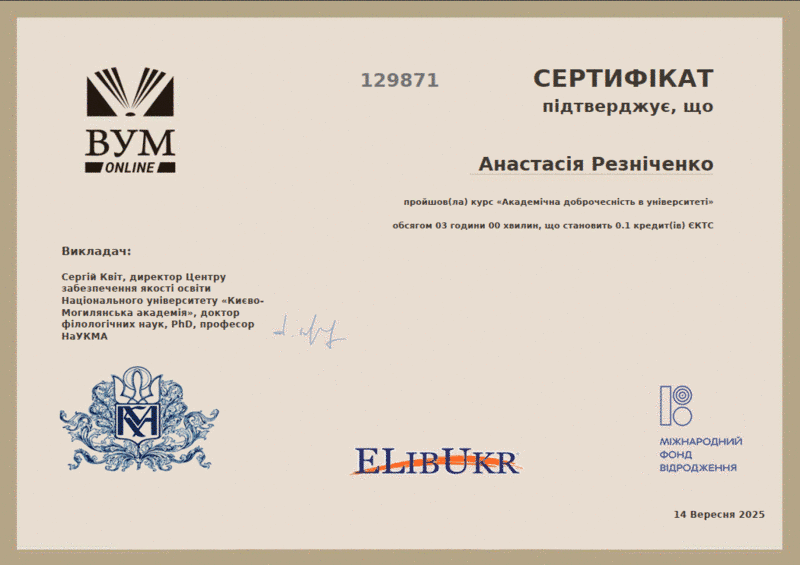 – курс «Академічна доброчесність в університеті» на платформі ВУМ Online, обсягом 3 години (0,1 кредиту ЄКТС), який пройшла Резніченко Анастасія.