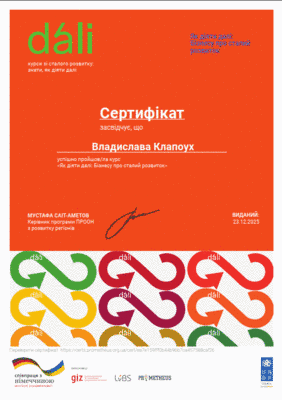 Клапоух Владислава успішно завершила курс «Як діяти далі: бізнесу про сталий розвиток», спрямований на формування системного розуміння концепції сталого розвитку, ролі бізнесу в досягненні Цілей сталого розвитку ООН, а також інтеграції принципів сталості в управлінські та бізнес-процеси. За результатами навчання здобувачка отримала сертифікат, що підтверджує опанування відповідного обсягу навчального матеріалу в межах неформальної освіти.