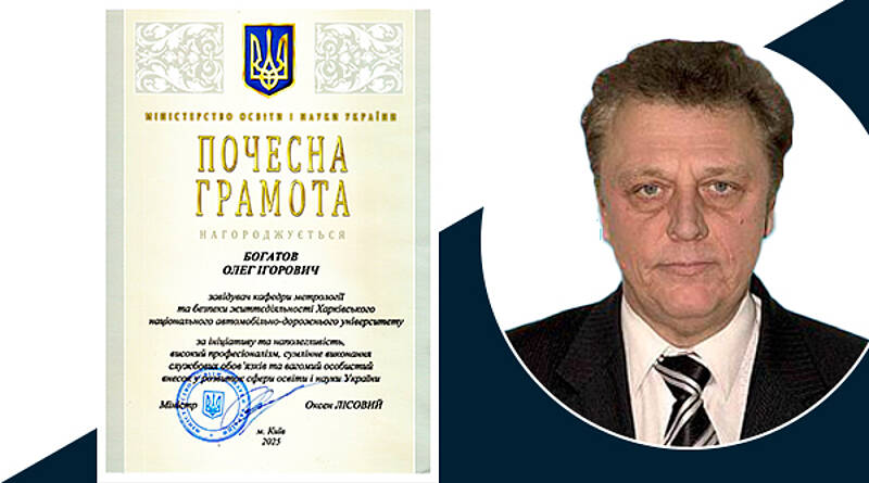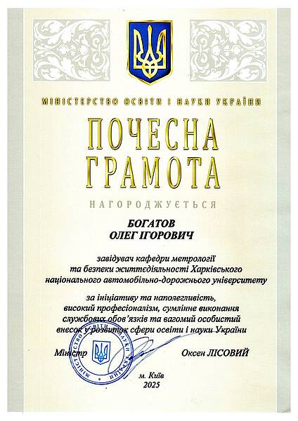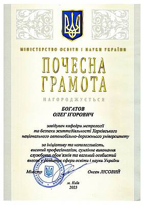Почесною грамотою Міністерства освіти і науки України БОГАТОВА Олега Ігоровича - завідувача кафедри метрології та безпеки життєдіяльності Харківського національного автомобільно-дорожнього університету.