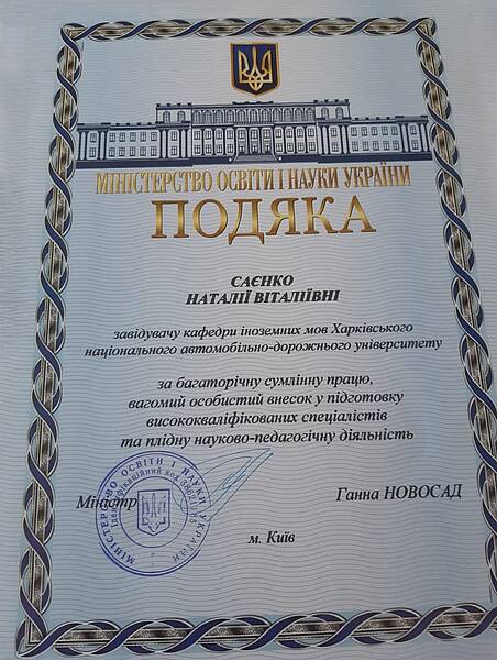 Завідувачка кафедрою іноземних мов Харківського національного автомобільно-дорожнього університету Саєнко Наталія Віталіївна отримала Подяку від Міністерства освіти і науки України за багаторічну сумлінну працю, вагомий особистий внесок у підготовку висококваліфікованих спеціалістів та плідну науково-педагогічну діяльність.