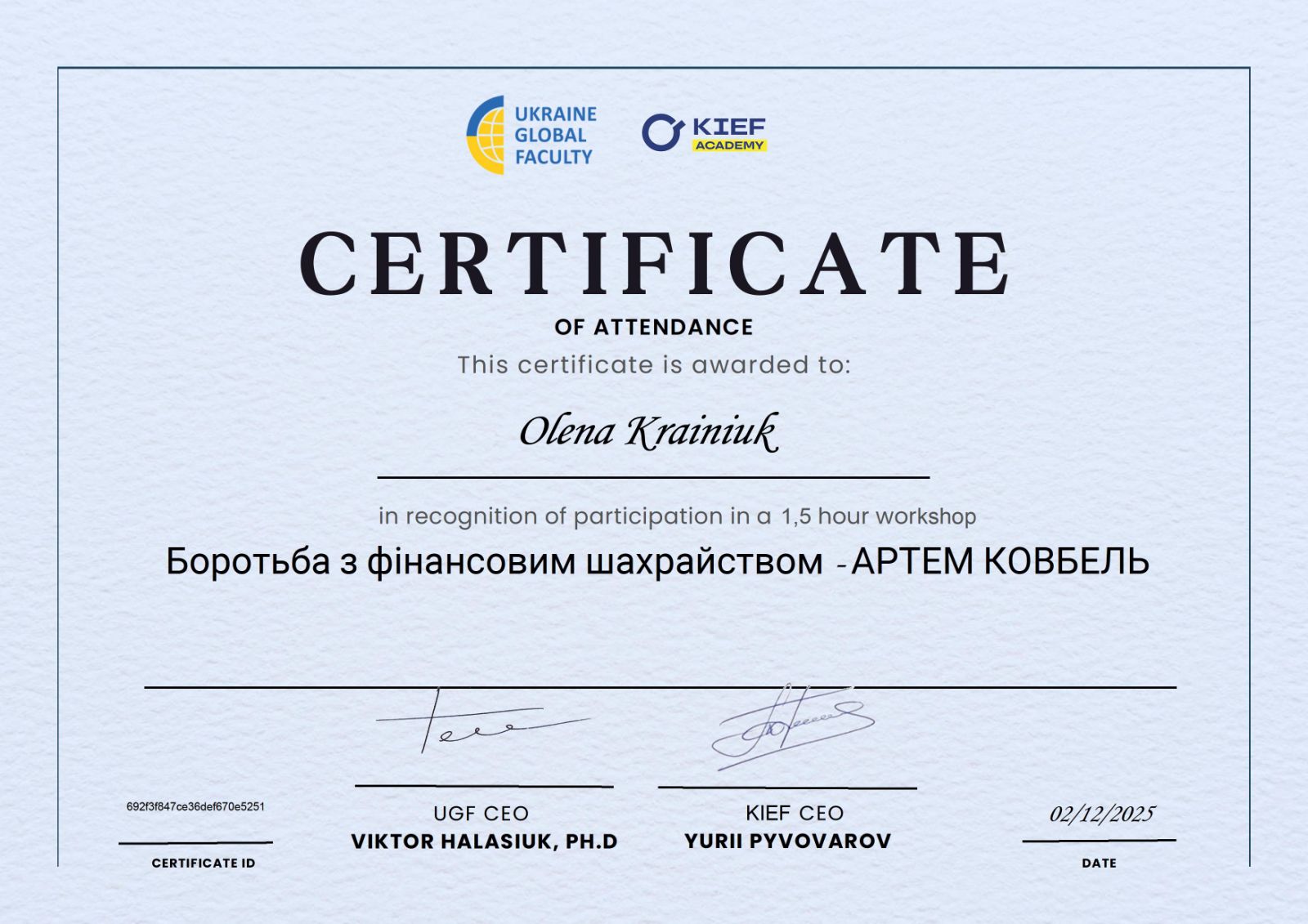 Питання економічної безпеки та розслідування фінансових зловживань стають дедалі актуальнішими в контексті сучасної кібербезпеки. Викладачі кафедри кібербезпеки продовжують поглиблювати свою експертизу в цих напрямках. 2 грудня 2025 року завідувачка кафедри Олена Крайнюк взяла участь у спеціалізованому семінарі «Боротьба з фінансовим шахрайством», організованому освітньою платформою Ukraine Global Faculty. Спікером заходу виступив Артем Ковбель — сертифікований аудитор, співвласник компанії Crowe Erfolg та визнаний експерт у сфері форензік. Учасники семінару детально розглянули такі ключові теми: • Основні ризики корпоративного шахрайства: аналіз загроз, з якими стикається сучасний бізнес; • Ознаки та методи протидії: як своєчасно виявити підозрілу активність та побудувати ефективну систему захисту; • Практичні кейси (форензік): розбір реальних ситуацій боротьби з фінансовими махінаціями. Здобуті знання допоможуть актуалізувати навчальні матеріали дисциплін кафедри, додавши до них практичні аспекти корпоративної безпеки та фінансових розслідувань.