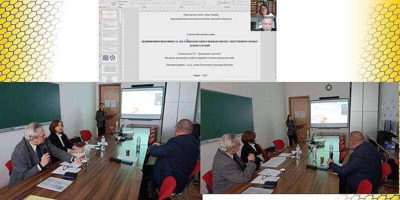 28 січня 2026 року на засіданні разової спеціалізованої вченої ради відбувся публічний захист дисертації на здобуття ступеня доктора філософії здобувачки кафедри транспортних технологій ХНАДУ Вікторії Севідової. Здобувачка успішно захистила дисертацію на тему "Підвищення ефективності доставки вантажів у міжнародному сполученні в умовах діджиталізації" за спеціальністю 275 "Транспортні технології на автомобільному транспорті". Робота присвячена впровадженню цифрових рішень у логістичні процеси міжнародних перевезень і має практичну цінність для транспортно-логістичної галузі. Захист відбувся у змішаному форматі (очно та з використанням дистанційних технологій). У роботі ради взяли участь офіційні опоненти  д.т.н., професор, завідувач кафедри транспортних систем та логістики Українського державного університету залізничного транспорту Ломотько Денис Вікторович, д.т.н., професор, завідувач кафедри міжнародних перевезень та митного контролю Національного транспортного університету  Прокудін Георгій Семенович, та рецензенти к.т.н., доцент кафедри транспортних технологій, ХНАДУ Орда Олександра Олександрівна, к.т.н., доцент кафедри транспортних технологій, ХНАДУ Потаман Наталя Володимирівна. Колектив кафедри щиро вітає здобувачку Вікторію Севідову та наукового керівника доцента Олександра Калініченка з успішним захистом і бажає подальших наукових звершень, професійного зростання та нових здобутків!