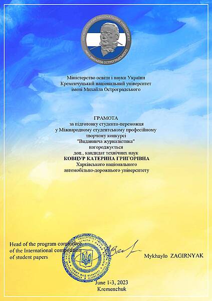 У важкі часи найважливіше - не загубити віру, надію і підтримку! Такі моменти ставлять перед випробуванням, але саме тоді, маємо виявити найбільшу силу волі і духовну стійкість. Викладачі кафедри транспортних систем і логістики постійно підтримують тісну комунікацію зі здобувачами, така колаборація виливається у гідні здобутки та перемоги! Вітаємо керівників к.т.н. Катерину Ковцур та к.т.н. Наталію Птицю, які направляли, допомагали, підтримували та надихали здобувачів факультету транспортних систем, що стали переможцями Міжнародного студентського професійного творчого конкурсу "Видавнича журналістика". Творчого натхнення здобувачам та їх керівникам!