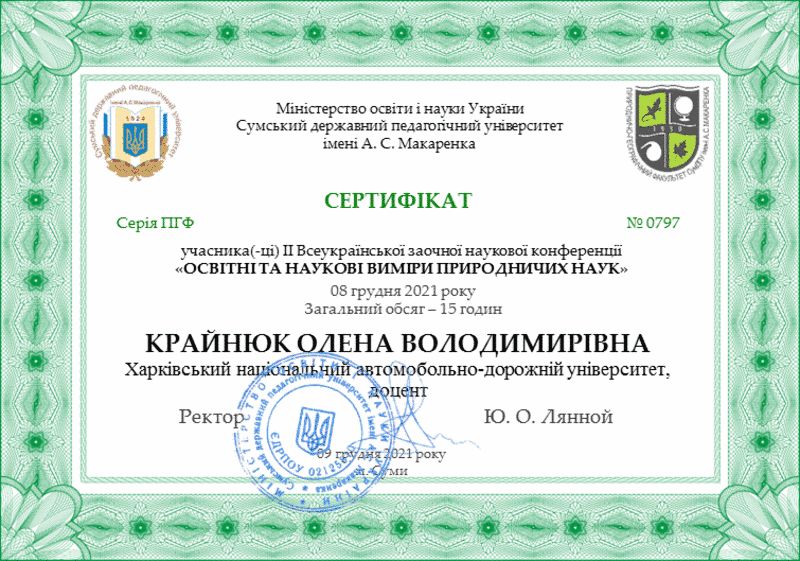 Олена Володимірівна Крайнюк доцент кафедри МБЖД 8 грудня 2021 року прийняла участь у Всеукраїнській науковій конференції "ОСВІТНІ ТА НАУКОВІ ВИМІРИ ПРИРОДНИЧИХ НАУК". Презентовані результати вимірювання параметрів екосистеми та визначення екологічної небезпеки людині та довкіллю від природних пожеж.