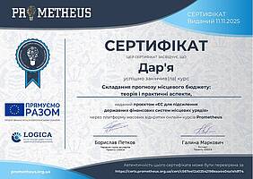 Здобувачі першого (бакалаврського) рівня вищої освіти зі спеціальності 073 «Менеджмент» – Олександр Косюк, Тетяна Картавцева, Дар’я Фокіна та Марія Цимбаліст – успішно взяли участь у програмі неформальної освіти «Складання прогнозу місцевого бюджету: теорія і практичні аспекти», реалізованій у межах проєкту «ЄС для підсилення державних фінансових систем місцевих урядів» на платформі масових відкритих онлайн-курсів Prometheus.