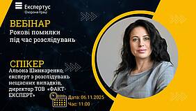 06 листопада відбувся вебінар "Рокові помилки під час рослідування". Спікером виступила експерт з рослідувань нещасних випадків, директор ТОВ "ФАКТ-ЕКСПЕРТ" Альона Шинкаренко.
