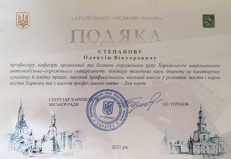 Кафедра організації та безпеки дорожнього руху вітає д.т.н., проф. Степанова Олексія Вікторовича з нагородженням Почесною грамотою виконавчого комітету Харківської міської ради за багаторічну сумлінну й плідну працю, високий професіоналізм, вагомий внесок у розвиток освіти і науки міста Харкова та з нагоди професійного свята - Дня науки.