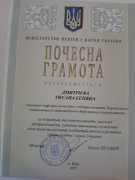 Колектив кафедри економіки і підприємництва щиросердно вітає завідувачку кафедри, д.е.н., проф. Дмитрієву Оксану Іллівну,  декана факультету підготовки іноземних громадян, професора кафедри, д.н. з галузі управління та адміністрування, проф. Левченко Ярославу Сергіївну, директорку Центру освітніх послуг, доцента кафедри, к.е.н., доц. Шершенюк Олену Миколаївну із нагородженням Почесною грамотою Міністерства освіти і науки України за ініціативу та наполегливість, високий професіоналізм, сумлінне виконання службових обов’язків та вагомий особистий  внесок у розвиток сфери освіти і науки України.