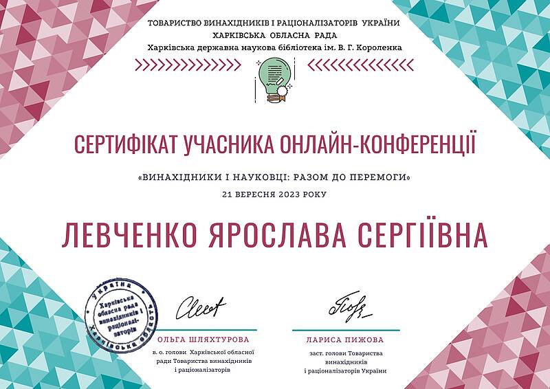 Проф. кафедри економіки і підприємництва Ярослава ЛЕВЧЕНКО взяла участь в онлайн-конференції з нагоди Дня винахідника і раціоналізатора України «Винахідники і науковці: разом до Перемоги!», яка відбулася 21 вересня 2023 р. о 10-00.