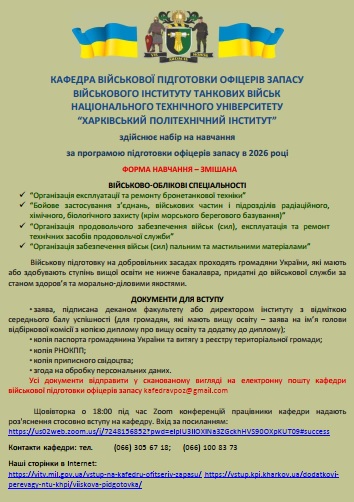 - на військову підготовку можуть вступати громадяни України, які мають або здобувають ступінь вищої освіти не нижче бакалавра (студенти всіх форм навчання з 2 по 5 (6) курси, випускники закладів вищої освіти).