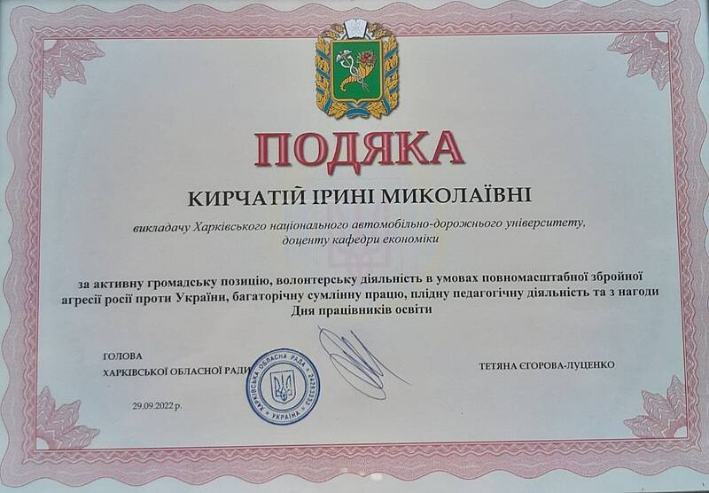 Доцент кафедри економіки і підприємництва, к.е.н., доцент Кирчата Ірина Миколаївна нагороджена Подякою Харківської обласної ради «За активну громадську позицію, волонтерську діяльність в умовах повномасштабної збройної агресії росії проти України, багаторічну сумлінну працю, плідну педагогічну діяльність та з нагоди Дня працівника освіти».