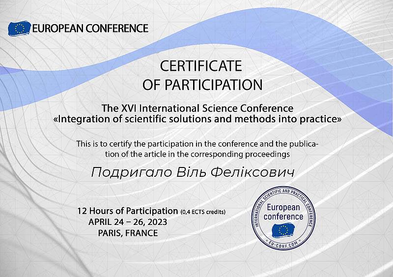 The XVI International Scientific and Practical Conference «Integration of scientific solutions and methods into practice», April 24 – 25, Paris, France.