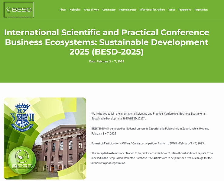 З 3 по 7 лютого 2025 р. відбулася міжнародна науково-практична конференція «Екосистеми бізнесу: сталий розвиток 2025 (BESD-2025)» Під час конференції були розглянуті актуальні питання, які можуть стати основою для формування нового економічного ландшафту, що ґрунтується на сталості, технологічних інноваціях і розвитку людського капіталу. Конференція проходила у Національному університеті "Запорізька політехніка" у гібридному форматі участі. Прийняті матеріали плануються до публікації в книзі міжнародного видання та проіндексовані в наукометричній базі даних Scopus. Доцент кафедри Екології, к.т.н. Душкін Станіслав Сергійович, прийняв безпосередню участь у конференції за напрямом "Виробничі технології, орієнтовані на зелений перехід ("Production Technologies focused on the green transition") з науковою роботою "Removal of heavy metals from sewage sludge for use as fertiliser" (Видалення важких металів з осаду стічних вод для використання їх в якості добрива). Участь в конференції підтвердження відповідним сертифікатом що передбачає 120 академічних годин (4 ECTS CREDITS) в період з 20 січня по 15 березня 2025 р.