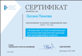 Керівник відділу акредитації, стандартизації та якості навчання пройшла навчання за курсом «Професійні та освітні кваліфікації: актуальні методологічні підходи для закладів вищої освіти», розробленим Національним агентством кваліфікацій, та отримала сертифікат про успішне його завершення. Підвищення кваліфікації за даним напрямом є важливим елементом розвитку системи забезпечення якості освіти та впровадження професійних кваліфікацій в освітній процес університету. Отримані результати навчання сприятимуть удосконаленню освітніх програм, їх узгодженню з вимогами ринку праці, а також підвищенню практичної спрямованості підготовки здобувачів вищої освіти. Реалізація підходів щодо інтеграції професійних кваліфікацій у систему вищої освіти відповідає сучасним вимогам розвитку освітнього простору та стратегічним пріоритетамнапрямкам розвитку університету.