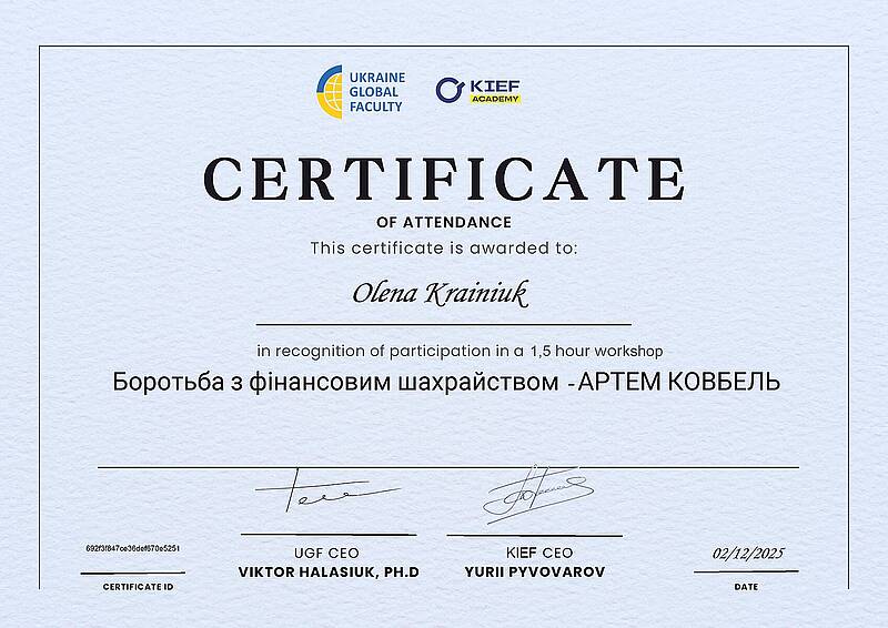 2 грудня 2025 року завідувачка кафедри кібербезпеки Олена Крайнюк взяла участь у професійному воркшопі «Боротьба з фінансовим шахрайством» в рамках ініціативи Ukraine Global Faculty. Спікером виступив експерт з форензік-розслідувань Артем Ковбель.