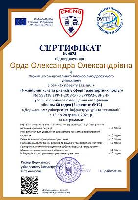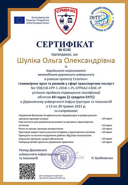 Доценти кафедри транспортних технологій Орда О.О. та Шуліка О.О. в рамках проекту Erasmus+ «Інжиніринг криз та ризиків у сфері транспортних послуг» успішно пройшли підвищення кваліфікації обсягом 60 годин (2 кредити ЄКТС) в Державному університеті інфраструктури та технологій з 13 по 20 травня 2021 р.