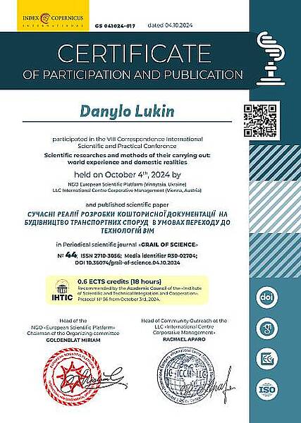 Науково-дослідна група кафедри мостів, конструкції і будівельної механіки ім. В.О.Російського у складі викладачів кафедри доцента Безбабічевої О.І та доцента Лукіна О.М, представника виробництва провідного інженера кошторисника Верютіної Л.О та аспіранта Лукіна Д.О. прийняли участь у VIII Міжнародної науково-практичної конференції SCIENTIFIC RESEARCHES AND METHODS OF THEIR CARRYING OUT: WORLD EXPERIENCE AND DOMESTIC REALITIES, 4 жовтня 2024р. з публікацією статі.