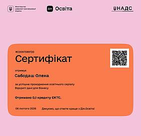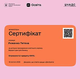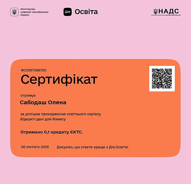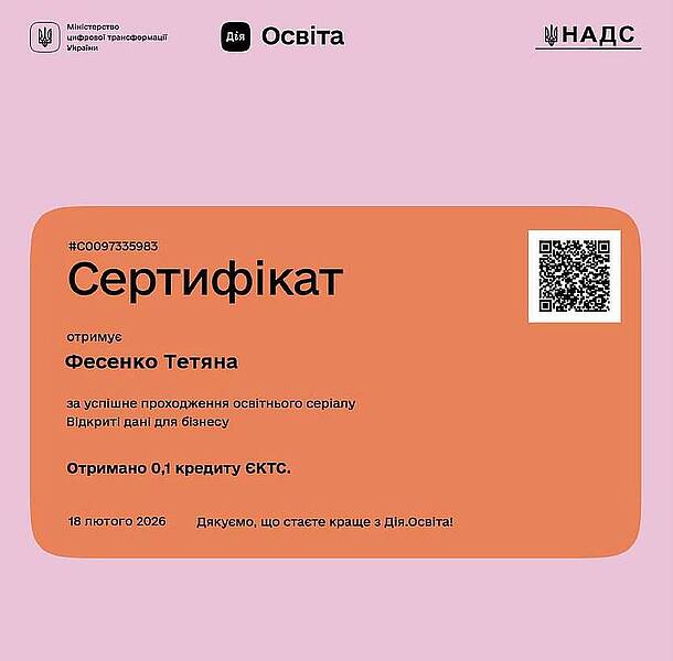 Так здобувачки вищої освіти на другому (магістерському) рівні за ОПП «Економіка» зі спеціальності С1 «Економіка та міжнародні економічні відносини» спеціалізації С1.01 «Економіка» Риженко Тетяна та Фесенко Тетяна і здобувачка вищої освіти на другому (магістерському) рівні за ОПП «Підприємництво, торгівля та біржова діяльність» зі спеціальності D7 «Торгівля» Сабодаш Олена пройшли освітній серіал «Відкриті дані для бізнесу» на освітній едьютейнмент-платформі Дія.Освіта Міністерства цифрової трансформації України, отримали іменні сертифікати та додаткові бали до підсумкової оцінки з вибіркового освітнього компоненту «Економічна діагностика».