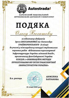 Окремо відзначено внесок завідувача кафедри Олега Богатова, якому висловлено подяку за підготовку здобувачів Ірини Бессарабової та Олександра Грайворонського, зокрема за результат І місце у зазначеному конкурсі. Подяку вручено 22 січня 2026 року від імені в.о. ректора Анжеліки Батракової.