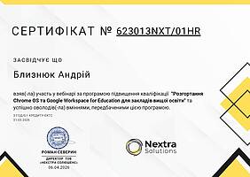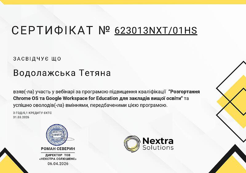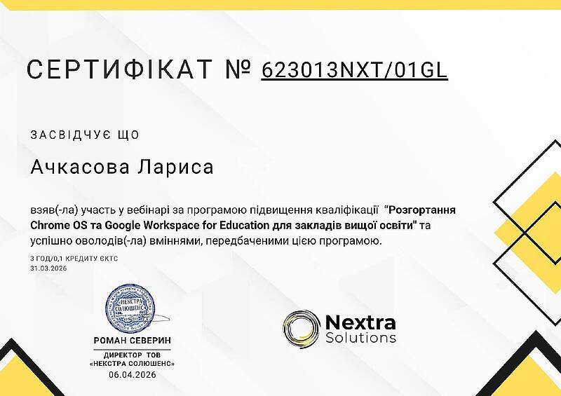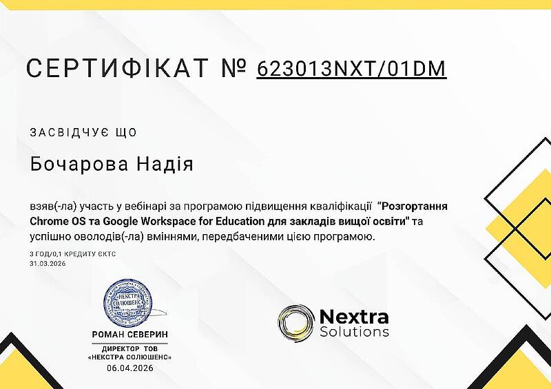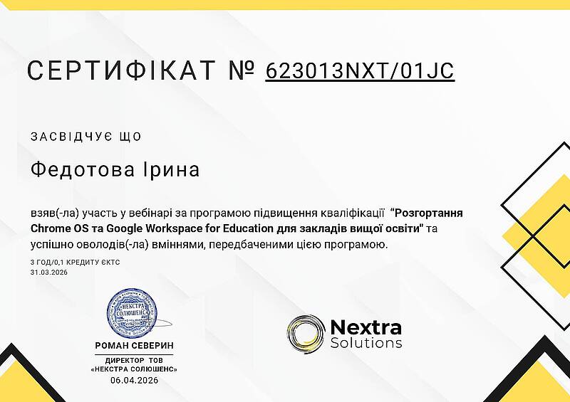 31 березня 2026 року викладачі кафедри менеджменту проф. Ірина Федотова, доц. Лариса Ачкасова, доц. Андрій Близнюк, доц. Надія Бочарова й доц. Тетяна Водолажська взяли участь у підвищенні кваліфікації у практичному вебінарі «Розгортання Chrome OS та Google Workspace for Education для закладів освіти», організованому для представників закладів вищої освіти. За результатами навчання учасники успішно отримали сертифікати, що підтверджують підвищення їхніх цифрових компетентностей.