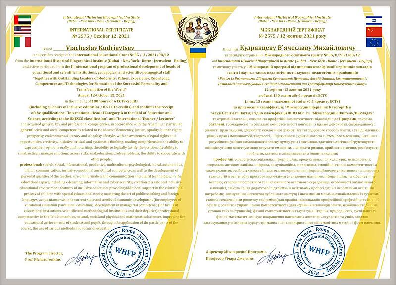 Проректор з наукової роботи, проф. Дмитрієв І.А., декан факультету управління та бізнесу, доц. Шевченко І.Ю., декан факультету підготовки іноземних громадян, доц. Кудрявцев В.М., директор Центру освітніх послуг, доц. Шершенюк О.М. і завідувач кафедри економіки і підприємництва, доц. Дмитрієва О.І. отримали від Міжнародного історико-біографічного інституту (Дубай – Нью-Йорк – Рим – Єрусалим – Пекін) Міжнародний освітній грант № EG/U/2021/08/12 на участь у ІІ Міжнародній програмі підвищення кваліфікації керівників закладів освіти, а також педагогічних та науково-педагогічних працівників «Разом із визначними лідерами сучасності: цінності, досвід, знання, компетентності і технології для формування успішної особистості та трансформації оточуючого світу».