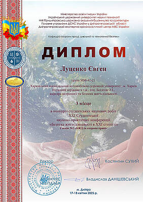 У конкурсі представив роботу здобувач групи ММ-36т1-22 Луценко Євген під керівництвом к.т.н., доц. кафедри метрології та БЖД Богатова О.І.