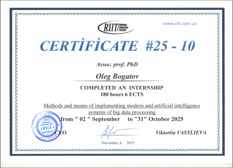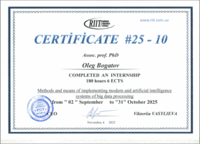 Завідувач кафедри метрології та БЖД Олег Богатов у період з 02 вересня по 31 жовтня 2021 пройшов стажування на тему "Методи та засоби впровадження сучасних систем обробки великих даних зі штучним інтелектом" (180 годин / 6 ECTS) на базі RIIT.
