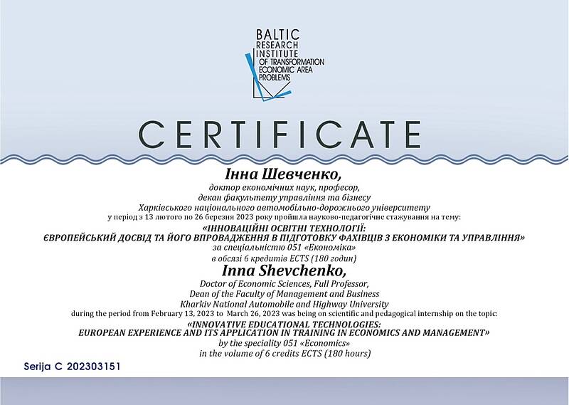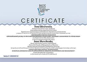 Декан факультету управління та бізнесу, професор кафедри економіки і підприємництва, д.е.н., проф. Шевченко І.Ю. у період 13.02.-26.03.2023 р. пройшла науково-педагогічне стажування на тему: «Інноваційні освітні технології: Європейський досвід та його впровадження в підготовку фахівців з економіки та управління» за спеціальністю 051 «Економіка» в обсязі 6 кредитів ECTS (180 годин) в Балтійському науково-дослідному інституті проблем трансформації економічного простору (м. Рига, Латвія).