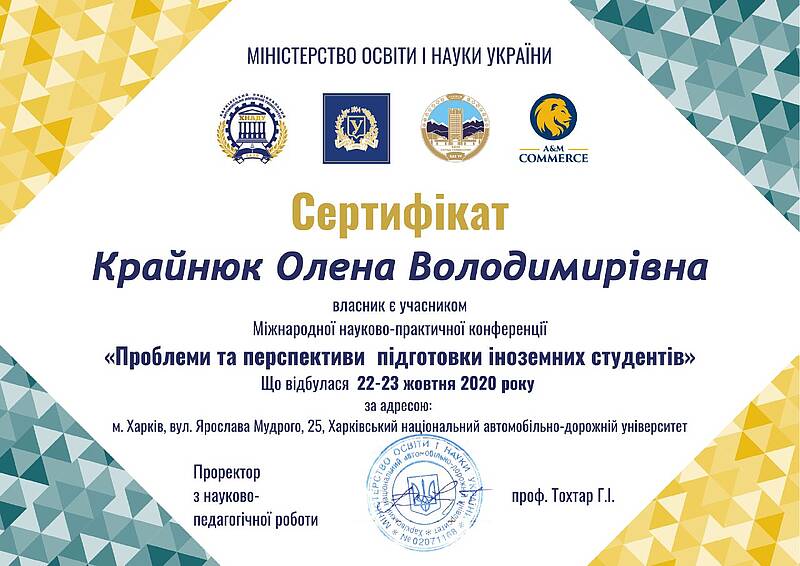Кафедра взяла участь у Міжнародній науково-практичній конференції «Проблеми і перспективи підготовки іноземних студентів», яку присвячено 90-річчю ХНАДУ (22-23 жовтня 2020 р.)