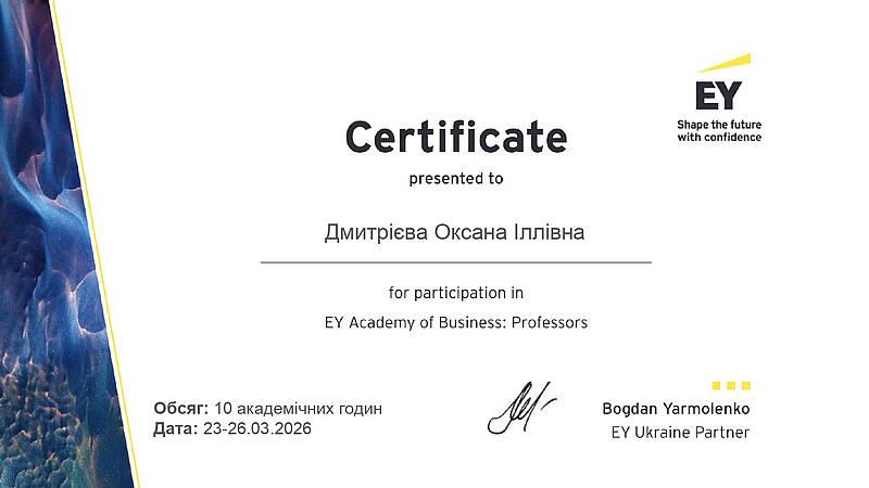 Викладачі кафедри економіки і підприємництва, професорка Дмитрієва Оксана Іллівна, доцентка Деділова Тетяна Вікторівна та старший викладач Прокопенко Микола Вікторович, долучилися до участі в міжнародному освітньому проєкті EY Academy of Business EY Academy of Business: Professors, який відбувся 23-26 березня 2026 року.