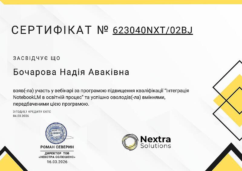 4 березня 2026 року викладачі кафедри менеджменту проф. Ірина Федотова, доц. Надія Бочарова й доц. Ольга Гетьман мали змогу удосконалити свої цифрові навички, взявши участь у вебінарі “Інтеграція NotebookLM в освітній процес”, який провела спікерка Оксана Міронова, консультантка КУ “Центр професійного розвитку педагогічних працівників Чернігівської міської ради” та сертифікована викладачка Google (Level 1, Level 2).