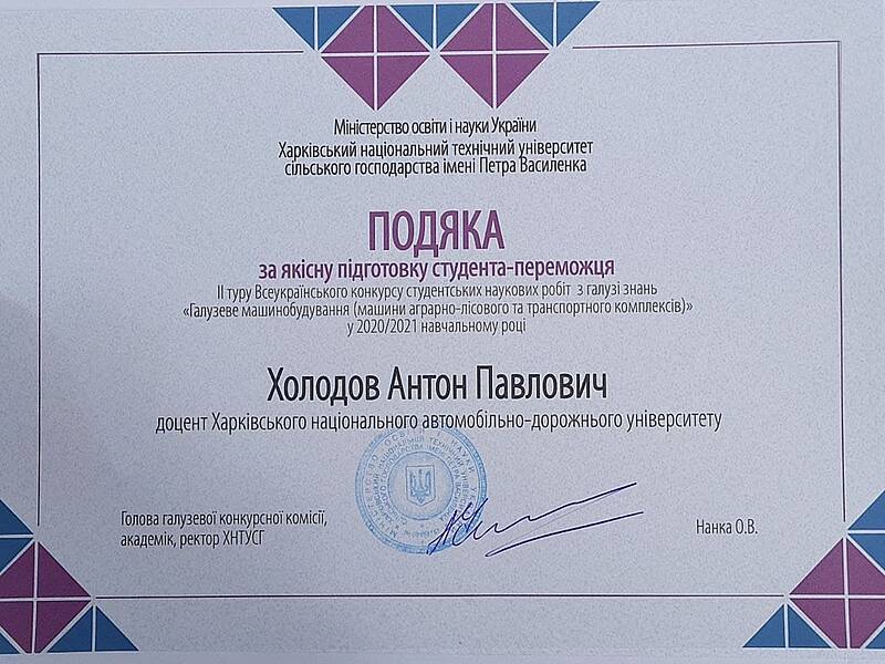 Студент Коваленко Микола Сергійович отримав ДИПЛОМ третього ступеня ІІ туру Всеукраїнського конкурсу студентських наукових робіт у галузі знань «Галузеве машинобудування (машини аграрно-ліcового і транспортного комплексів)» та його керівника Холодова Антона Павловича. Кафедра будівельних і дорожніх машин пишається такими студентами та співробітниками!
