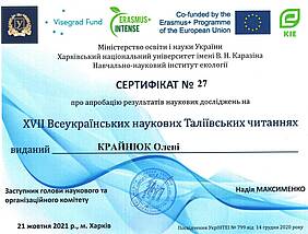 ВІТАЄМО: Доцента каф. МБЖД О. В. Крайнюк з отриманням у XVII Всеукраїнських наукових Талієвських читаннях сертифікату про апробацію своїх результатів дослідження з теми: "Екологічна небезпека виникнення пожеж на територіях природно-заповідного фонду".