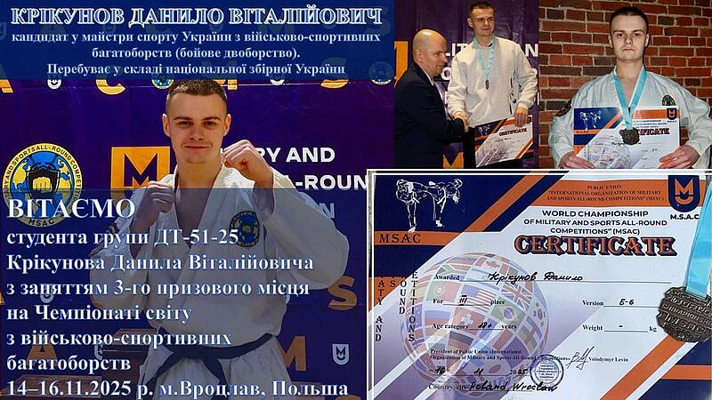 ВІТАЄМО студента групи ДТ-51-25 КРІКУНОВА ДАНИЛА ВІТАЛІЙОВИЧА з заняттям 3-го призового місця на ЧЕМПІОНАТІ СВІТУ з військово-спортивних багатоборств 14–16.11.2025 р. у Республіці Польша, місті Вроцлав.