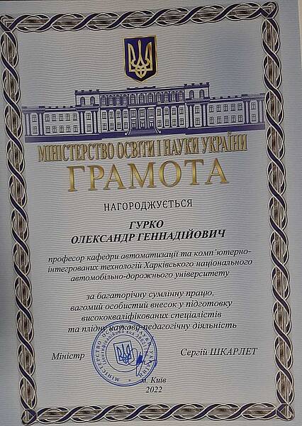 Завідувача кафедри автоматизації та комп’ютерно-інтегрованих технологій, професора Гурко Олександра Геннадійовича нагороджено Грамотою Міністерства освіти і науки України «За багаторічну сумлінну працю, вагомий особистий внесок у підготовку висококваліфікованих спеціалістів та плідну науково-педагогічну діяльність».