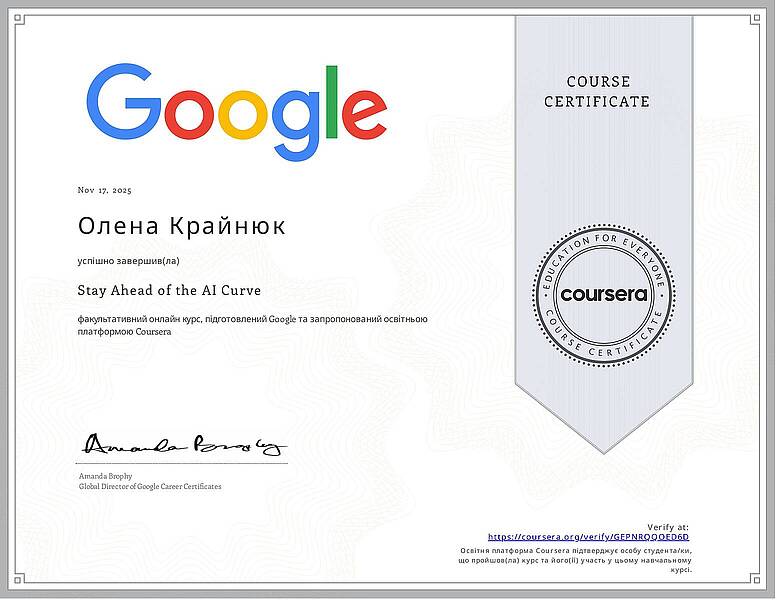 Завідувачка кафедри кібербезпеки Олени Крайнюк успішно завершила факультативний курс за спеціалізацією «Google AI Essentials».