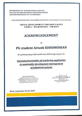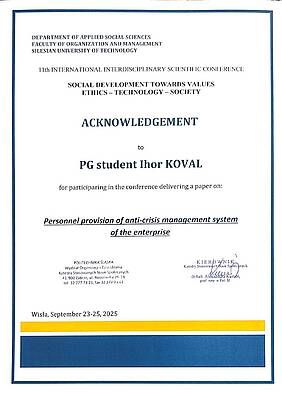 23-25 вересня 2025 року в місті Вісла (Польща) відбулася XI Міжнародна міждисциплінарна наукова конференція «Соціальний розвиток до цінностей ‒ Етика, Техніка, Суспільство», організована Політехнікою Сілезькою. Участь у цьому масштабному науковому заході взяли аспіранти кафедри економіки і підприємництва, здобувачі ступеня доктора філософії за освітньо-науковою програмою «Економіка» зі спеціальності 051 «Економіка» галузі знань 05 «Соціальні та поведінкові науки».