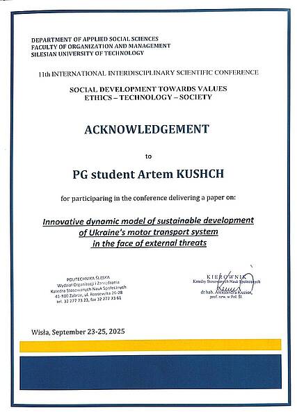 • Артем Кущ представив наукову доповідь «Innovative dynamic model of sustainable development of Ukraine's motor transport system in the face of external threats»;