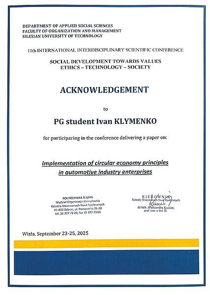 • Іван Клименко представив наукову доповідь «Implementation of circular economy principles in automotive industry enterprises»;