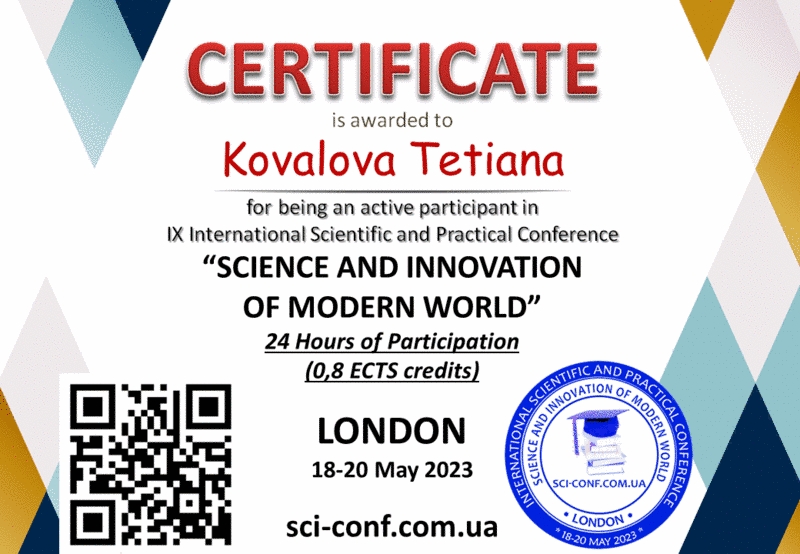 Cтудентка групи Еа 31 Половко А.В. під керівництвом завідувачки кафедрою обліку і оподаткування Ковальової Т.В. прийняли участь у роботі IX Міжнародної науково-практичної конференції «SCIENCE AND INNOVATION OF MODERN WORLD», що відбулась 18-20.05.2023 року у Лондоні, Великобританія. На конференцію була представлена доповідь "Особливості обліку розрахунків з постачальниками та підрядниками під час воєнного стану", яка є дуже актуальною в контексті поточних геополітичних подій в світі і обгрунтовує необхідність забезпечення безпеки та оборони країни. За результатами участі отримано сертифікати