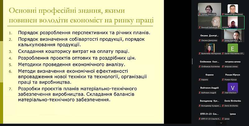 Метою зустрічі стало обговорення сучасних трендів трансформації регіональних ринків праці та їх впливу на формування і розвиток освітніх програм зі спеціальностей С1 «Економіка та міжнародні економічні відносини» (051 «Економіка») та D7 «Торгівля» (076 «Підприємництво та торгівля»).