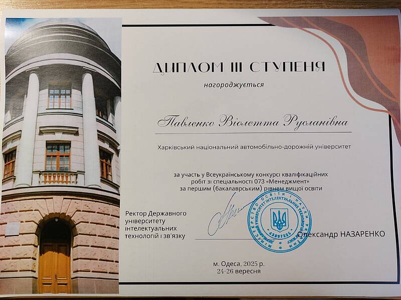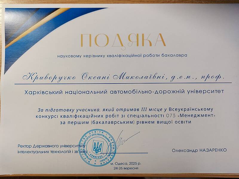 З 24 по 26 вересня 2025 року у Державному університеті інтелектуальних технологій і зв’язку (м. Одеса) відбувся Всеукраїнський конкурс кваліфікаційних робіт здобувачів вищої освіти зі спеціальності 073 «Менеджмент».
