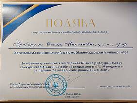• ІІІ місце (бакалаврський рівень, 1-й рівень вищої освіти) — Віолета Павленко, спеціальність 073 «Менеджмент». Науковий керівник — проф. Оксана Криворучко.