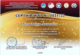 16 березня 2023 року МІЖНАРОДНА АКАДЕМІЯ ОСВІТИ І НАУКИ ЄВРОПЕЙСЬКИЙ ІНСТИТУТ ОСВІТИ І НАУКИ НАЦІОНАЛЬНА АКАДЕМІЯ НАУК ВИЩОЇ ОСВІТИ УКРАЇНИ ІНСТИТУТ ОСВІТИ ДОРОСЛИХ АСОЦІАЦІЯ ПСИХОТЕРАПЕВТІВ І ПСИХОАНАЛІТИКІВ УКРАЇНИ Європейський інститут освіти і науки провели науково-методичному вебінарі-тренінгу «ПІДГОТОВКА ГРАНТОВИХ ЗАЯВОК ТА ВЕДЕННЯ ГРАНТОВИХ ПРОЄКТІВ», який пройшов доцент кафедри будівельних і дорожніх машин Холодов Антон